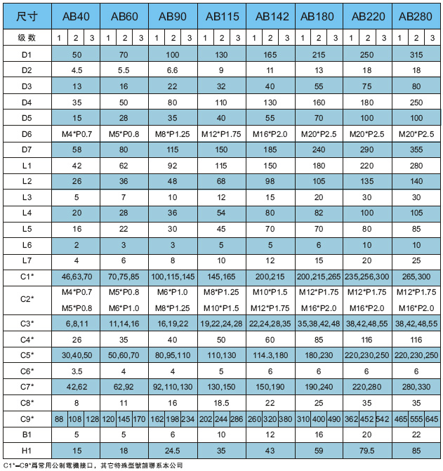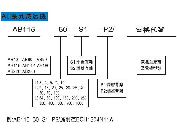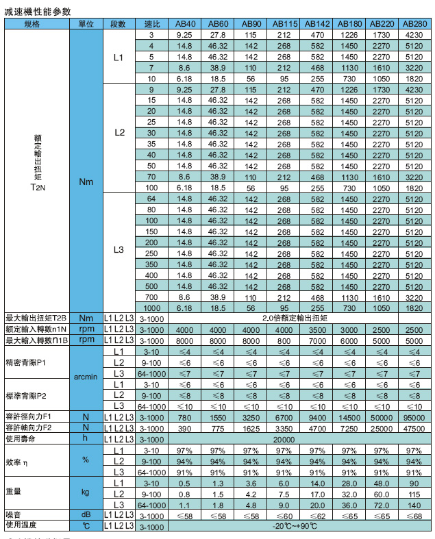 AB系列伺服行星減速器分:AB 40、60、90、115、140、180、220、280同軸式機(jī)座型號,速比:1-1000有20多個比速可選擇;分一、二、三級減速傳動;精度:傳動精度在2-4弧分,二級傳動精度在4-5弧分,三級傳動精度6-7弧分;等一千多種規(guī)格。